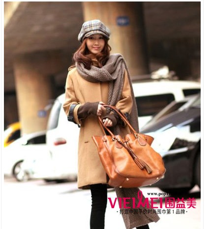 长款毛线围巾是今冬流行围巾的代表款式之一,由于它有足够的长度可以让你变换造型,所以受到大家的喜爱。这一款棕色的毛线围巾,立体小颗粒的编织款式让它显得更别致,冬季穿上一款驼色大衣,采用绕一圈前后放置的系法,突出随性温馨的感觉。搭配上头上的格子报童帽,似乎多了一份童真的美好。