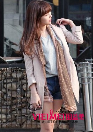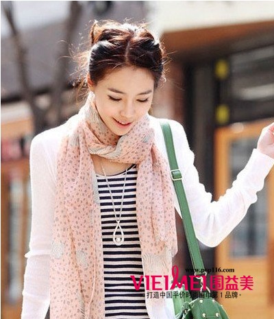 有线条和水玉圆点修饰的围巾看起来妩媚极了,柔美的配色显得清新柔和,随意搭在颈间,令造型显得更为知性,女人味也得到大大的提升。