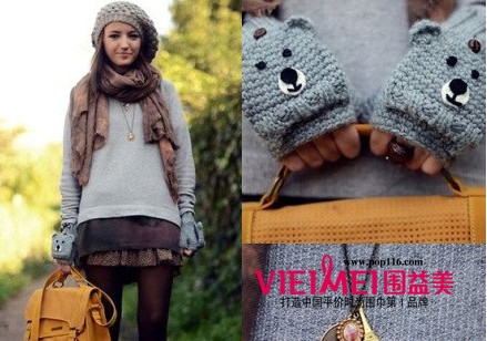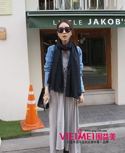 这一条洗旧染色风格的围巾十分适合今年大热的复古搭配,浅灰色的羊毛衫混搭长款T恤和短裙,穿出个性甜美的服饰风格