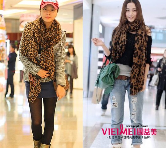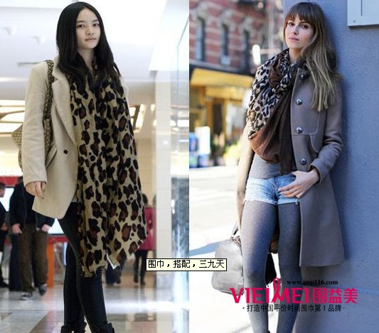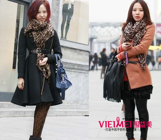 :“短衣长搭”与“长衣短搭”是一个非常实用的围巾搭配法则,画面上右侧的国外MM的围巾是AB面款,一面是豹纹,一面是深咖色,这样避免了豹纹图案过于密集不透气,其实自己也可以将一件单色的单品和豹纹组合做成这种效果。效果方式无处不在