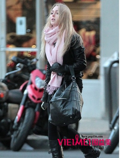 欧美女孩粗犷豪放的风格,黑色皮衣搭配粉色T恤,黑色小脚裤,平底鞋,配上灰色的围巾,很随性大方的搭配,简单利落。