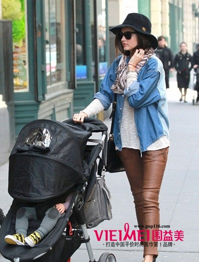 辣妈可儿扮演时尚牛仔女郎出街,休闲牛仔搭配时尚皮裤,又好好地诠释了一边牛仔风格。搭配豹纹围巾,帅气十足