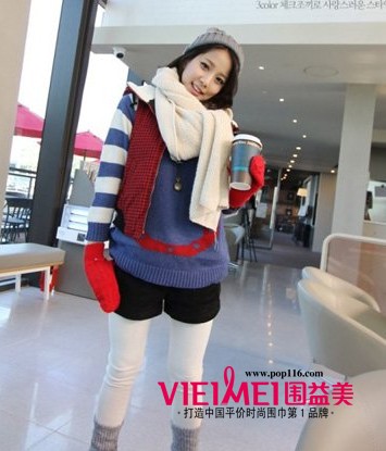 蓝色的羊毛衫搭配一件红色的马甲,用服饰的长度穿出层次感,而在下身的搭配方面,黑色短裤搭配白色裤袜和灰色的毛线短袜,让经典的黑白灰三色混搭出时尚的风格,搭配一对今年韩国非常流行的运动休闲鞋,展现出小女生可爱俏皮的个性。而白色的毛线围巾系出随意独特的造型,既增加了潮感,又有温度,再假设毛线帽、手套等配饰,全副武装,更不怕严寒的冬季了