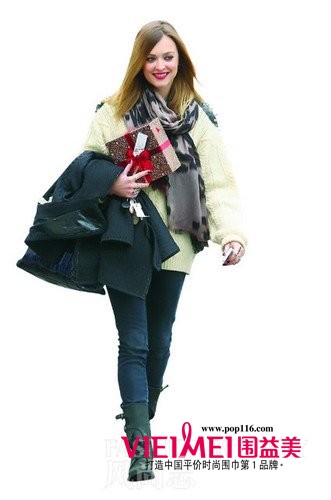 Fearne Cotton白色粗棒针毛衣看上去太乖,一定要用Mulberry手袋和豹纹围巾显出英伦个性。