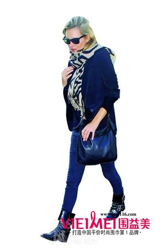 Kate Moss硬朗军靴很抢眼,花纹尺度比较大的动物纹围巾看似随意,却是多年时尚功力的表达。