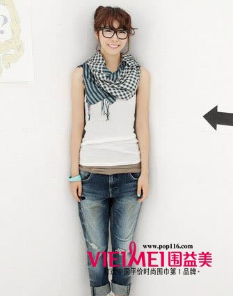 时值初秋,可以放心尝试夏日因为炎热望而却步的双色背心叠穿,搭配格子+条纹图案的方巾装饰,DIY出与众不同的上装。搭配人气不减的破洞磨旧牛仔裤,挽起裤脚的7分款式,增加可爱Sweet的灵动感。