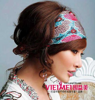 搭配建议:将丝巾对折成大三角,裹住头部及前额的一部分,两角在颈后交叉打结,再次交叉后系好,整理造型,让秀发同丝带一起自然下垂。