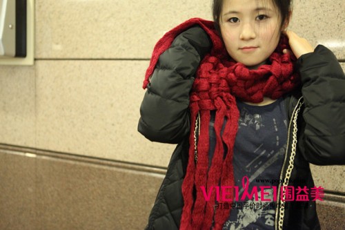 酒红色、淡粉红,还有鲜嫩的橙色围巾,这样相近色系的搭配显得很有和谐感,而且很有极具街拍的调调